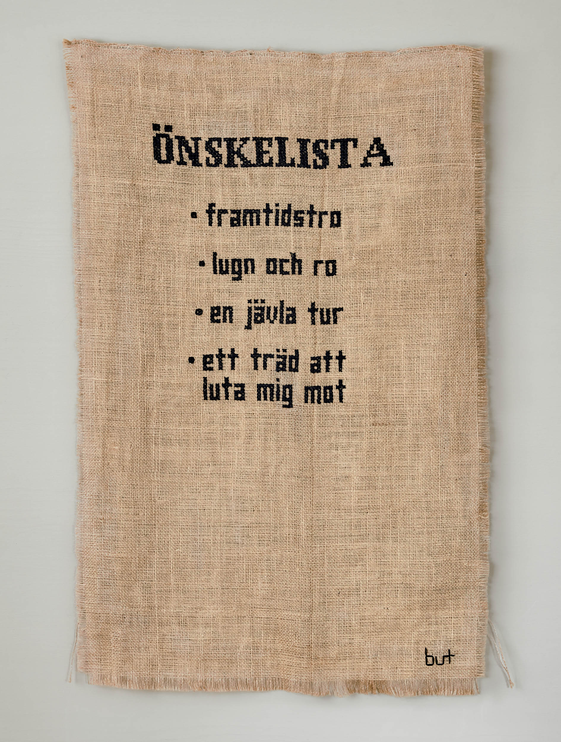 Gisela Ståle, Malmö, fann sitt konstnärskap i en tid präglad av utmattning och ångest, där behovet av fokus och stillhet blev avgörande. Genom att först formulera sina tankar i ord och sedan brodera dem, fann hon ett sätt att både förstå det inre och ge hjärnan vila. I processen får tanken ta plats en stund – därefter tar händerna över, i ett repetitivt, läkande arbete.