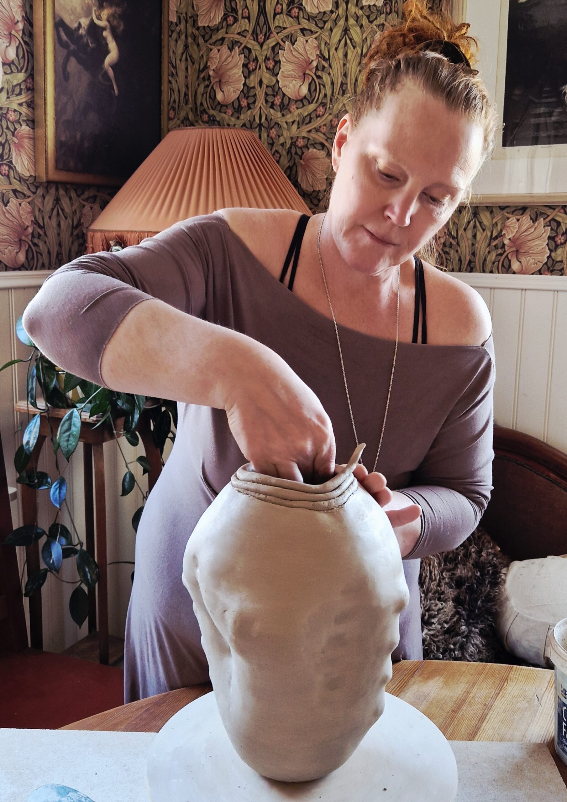 Anna Hedeås Lundbekk skapar keramiska former som är både urnor och frökapslar – behållare för liv, transformation och nyfikenhet. Hennes arbete i stengodslera, med ringlings- och kavlingsteknik, utforskar det icke ordinära och det symboliska. Urnorna rymmer både det fysiska och det själsliga liksom berättelser om livets cykler, naturens kraft och människans inre landskap. Hennes konst är en inbjudan att reflektera över hur liv, död och återfödelse samspelar i både natur och människa.